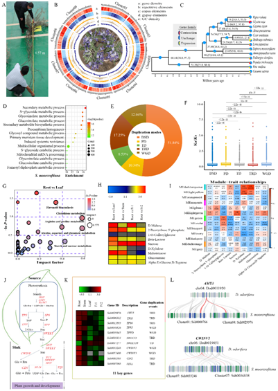 砂生槐(Sophora moorcroftiana)是西藏地区分布极广的一种多年生的豆科类灌木,其根系发达,具有极强的耐干旱、耐贫瘠、抗风沙的生态特征。作为西藏高原生态恢复的理想树种,砂生槐也是西藏放牧地区天然草地上的重要植物构成。因此该植物是研究高原地区植物适应性进化和抗旱的优良材料。然而,对该植物基因组学以及抗旱性的分子机制的研究仍相对较少。 近日,中国科学院昆明植物研究所青藏高原植物进化与适应课题组以“Sophora moorcroftianagenome analysis suggests an association between sucrose metabolism and drought adaptation”为题在Plant?Physiology发表论文。研究报道豆科槐属植物砂生槐的染色体水平参考基因组,并且结合代谢组和转录组的分析,揭示了蔗糖代谢与砂生槐干旱适应潜在的相关性。此项研究通过二三代测序技术,组装和注释了染色体水平高质量的砂生槐基因组,基因组大小为737.35?Mb,包括9条染色体、contig N50为22.5 Mb、注释了53,640个蛋白编码基因、BUSCO为98.3%。比较基因组学分析显示,栽培类豆科植物基因组中扩张的基因家族主要富集在固氮方面,而来自于中高海拔的豆科植物如砂生槐基因组中扩张的基因家族以及重复基因主要在代谢过程中发挥作用,可能与砂生槐的高原适应相关。 为了揭示砂生槐代谢在其高原适应中的作用,作者对砂生槐的根、茎、叶和果实进行了广靶代谢组学分析。研究发现,植物根部的差异代谢物主要富集在与干旱相关的“精氨酸和脯氨酸代谢”以及“淀粉和蔗糖代谢”途径,蔗糖在根部含量最高。代谢组和转录组的WGCNA关联分析发现,TRD和WGD重复事件导致蔗糖代谢通路基因AMY3和CWINV1基因家族的扩张推测是砂生槐根部蔗糖含量相对较高的原因,进而促进砂生槐发达的根系,增加其抗旱能力。这类基因的发现可以作为培育耐旱性高原植物的候选基因。 图1. A.砂生槐根长、冠幅、根颈直径、土深的数据测量过程。B.砂生槐基因组。C.基因家族树及基因家族扩张、收缩。D.砂生槐扩张基因家族的注释。E.砂生槐重复基因分类。F.砂生槐重复基因Ka/Ks。G. Root vs Leaf代谢通路的富集。H.?热图显示根部carbohydrate代谢物的相对含量与其他组织的比例。I. WGCNA分析。J.植物蔗糖代谢通路基因。K.热图显示11个关键基因的表达量及重复类型。L.砂生槐和D. odorifera中AMY3和CWINV1的共线性。 |